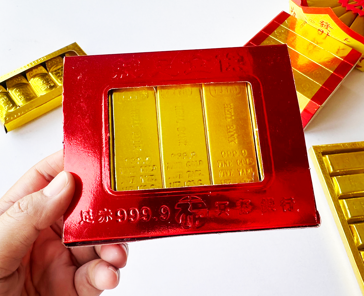 ทองแท่งเล็ก 5 แท่ง สื่อถึงความเจริญรุ่งเรืองและความโชคดี เหมาะสำหรับการไหว้เจ้าที่ ไหว้ตี่จู้เอี๊ยะ และเทพเจ้าแห่งการคุ้มครอง เช่น เจ้าพ่อกวนอู เพื่อขอพรให้ครอบครัวมีความมั่งคั่งและความสำเร็จ