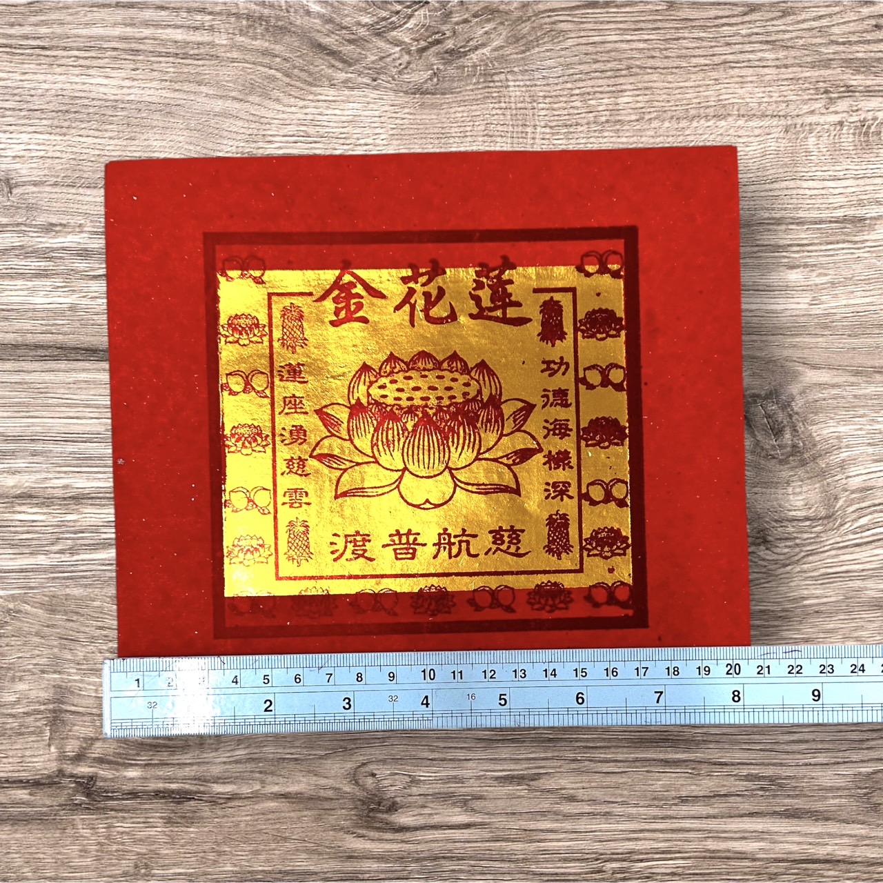 ขนาดกระดาษ โดยประมาณ 18.5*20.5 เซนติเมตรตั่วกิมลายดอกบัว ขนาด 70 ใบต่อชุด ทำจากกระดาษสีทองคุณภาพสูง ขอบส้มสวยงาม เหมาะสำหรับการไหว้เจ้า เทพเจ้า หรือบรรพบุรุษ ในพิธีสำคัญต่าง ๆ เช่น กงเต๊ก หรือวันไหว้เจ้าประจำปี ซึ่งกระดาษไหว้เจ้านี้ช่วยสื่อถึงความเคารพและความกตัญญูตามความเชื่อของคนไทยเชื้อสายจีนที่สืบทอดมาหลายรุ่นจ้ะ