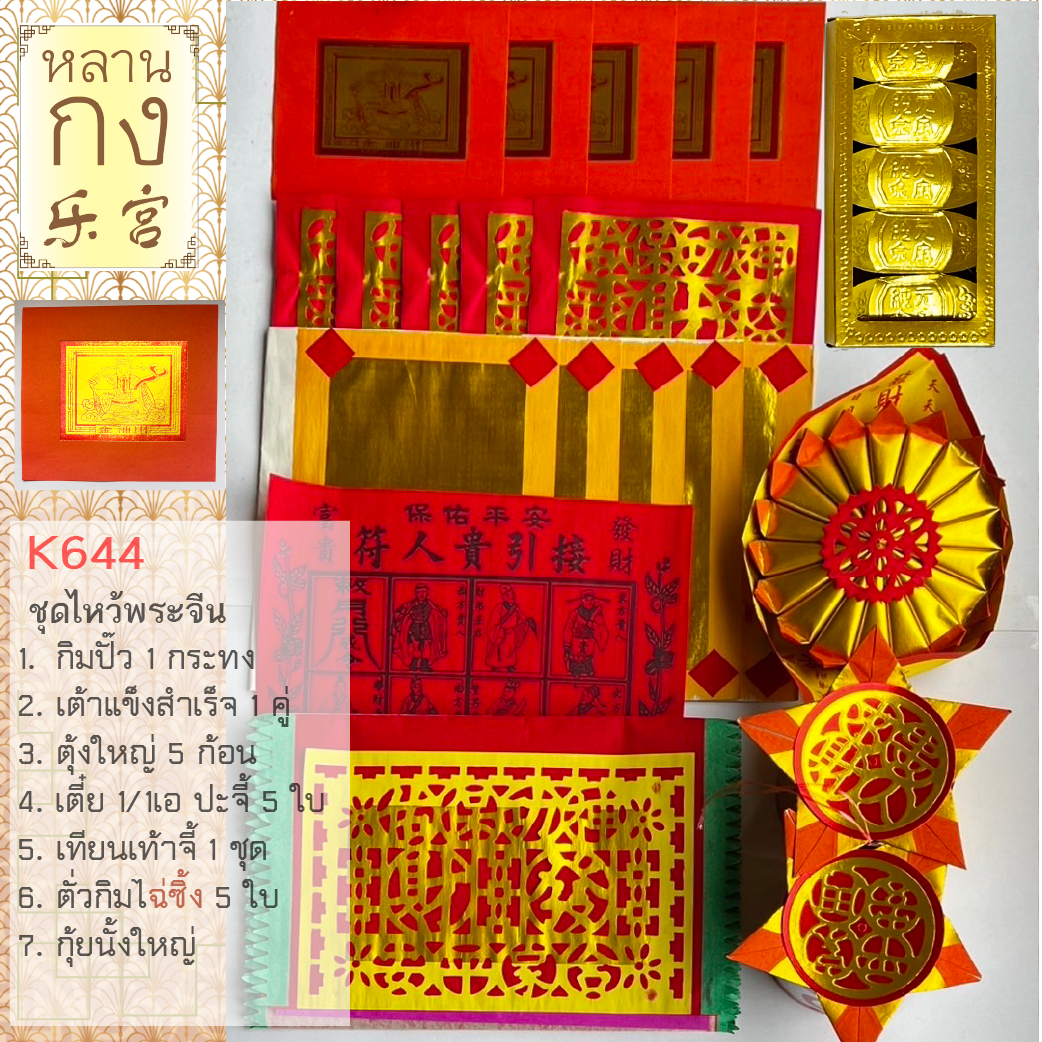 ชุดไหว้เจ้าที่และเทพเจ้าตามธรรมเนียมจีน เหมาะสำหรับบูชาเจ้าที่ประจำบ้าน ศาลเจ้า และเทพเจ้าต่าง ๆ ในเทศกาลสำคัญ เช่น ตรุษจีน สาร์ทจีน และสาร์ทประจำเดือน เพิ่มความเป็นสิริมงคล เสริมโชคลาภ และเสริมสร้างพลังบวกให้แก่ครอบครัว ชุด K644 นี้ครบครันด้วยกระดาษไหว้และอุปกรณ์บูชาคุณภาพสูงจากแบรนด์หลานกง พร้อมให้คุณได้ใช้ไหว้เจ้าตามประเพณีอย่างสมบูรณ์ ประกอบด้วย: