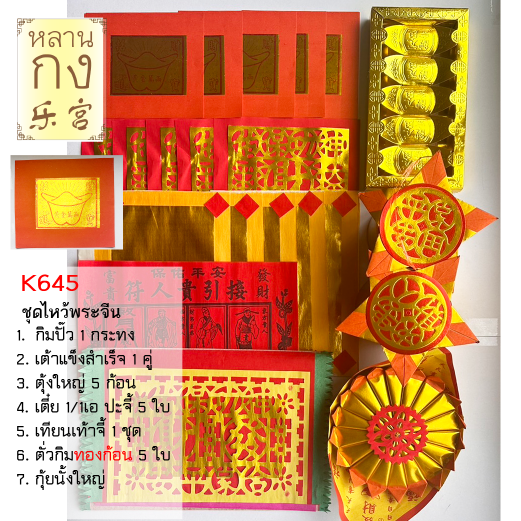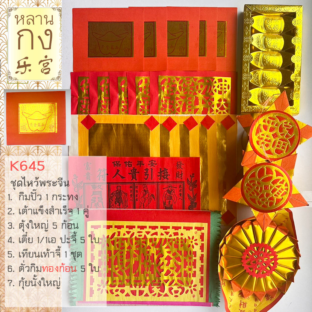 ชุดบูชาเจ้าที่และเทพเจ้าสำหรับการไหว้ตามเทศกาลและพิธีสำคัญ เสริมสิริมงคลและความเจริญรุ่งเรืองให้ครอบครัว เหมาะสำหรับการไหว้เจ้าที่ในบ้าน การบูชาที่ศาลเจ้า หรือใช้ในงานตั้งศาลใหม่ ผลิตจากกระดาษคุณภาพสูงของแบรนด์หลานกง ชุด K645 นี้ครบครันด้วยอุปกรณ์ไหว้ที่เป็นสัญลักษณ์แห่งโชคลาภและความสำเร็จ ประกอบด้วย: