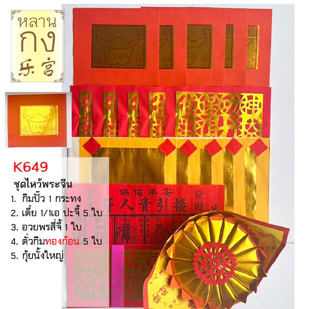 ชุดไหว้เจ้าที่และเทพเจ้าสำหรับเสริมความเป็นสิริมงคล ความสงบสุข และโชคลาภ เหมาะสำหรับบูชาเจ้าที่ในบ้าน ศาลเจ้า หรือเทพเจ้าประจำบ้าน ใช้ได้ในเทศกาลสำคัญอย่างตรุษจีน สาร์ทจีน หรือโอกาสพิเศษในการขอพรและเสริมพลังบวกให้ครอบครัว ชุด K649 นี้ผลิตจากกระดาษไหว้คุณภาพสูง ให้การบูชาเป็นไปอย่างสมบูรณ์ ประกอบด้วย: