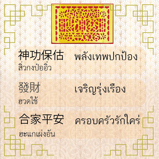 ✅ ตัวหนังสือมงคล: มีตัวอักษรทองคำ เช่น “ฮก” “กุ้ยนั้ง” “เผ่งอัง” “คิ่วใช้” “แกมึ้ง” “หับแก” และ “เผ่งอัง” เพื่อเสริมความหมายและความเป็นสิริมงคล